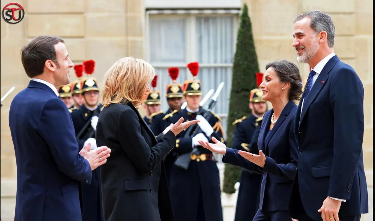 Macron welcomed King Felipe in the Courtyard of the Elysee Palace, Paris where First Lady Brigitte Macron blew a kiss in the direction of Queen Letizia as a way of greeting.