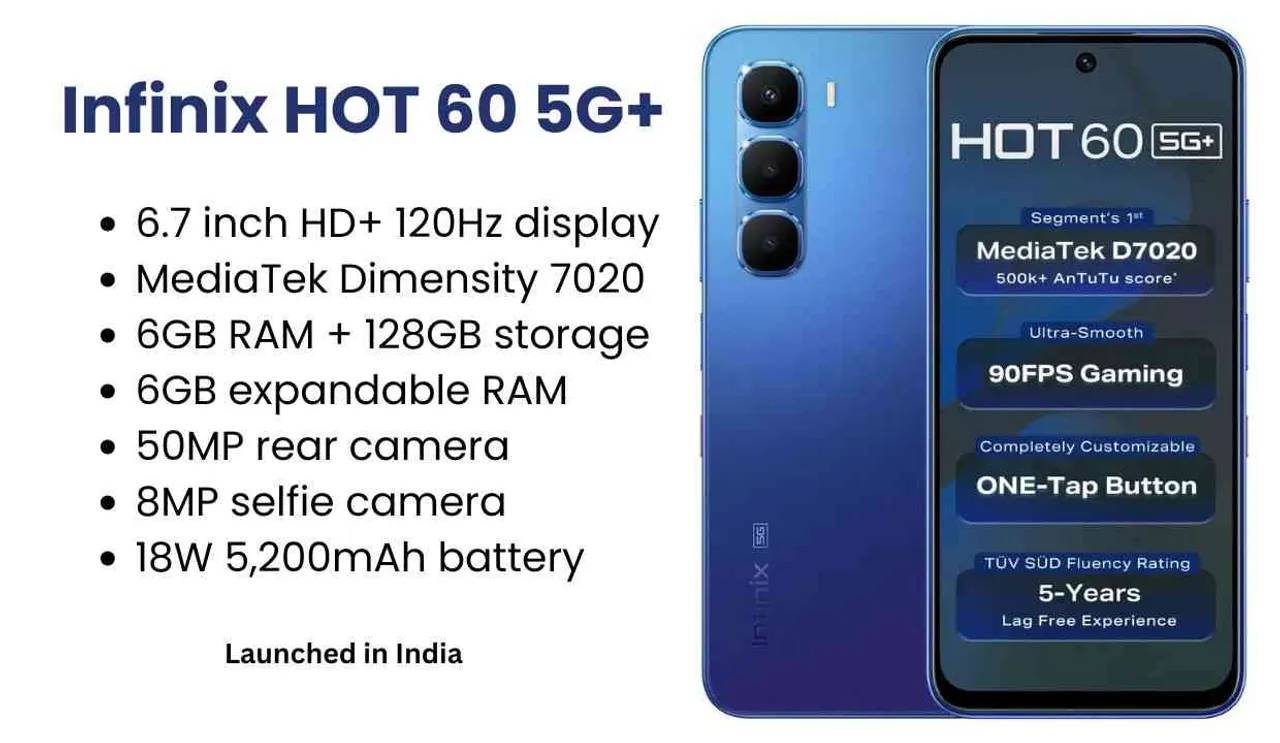 Infinix today expanded its product portfolio in the Indian market by launching a new smartphone Infinix HOT 60 5G+. This mobile is equipped with a powerful 5,200mAh battery and 12GB RAM (6GB+6GB) which also provides the power of AI. You can read further about the price, features and specifications of the new Infinix Hot 60 5G+ smartphone.