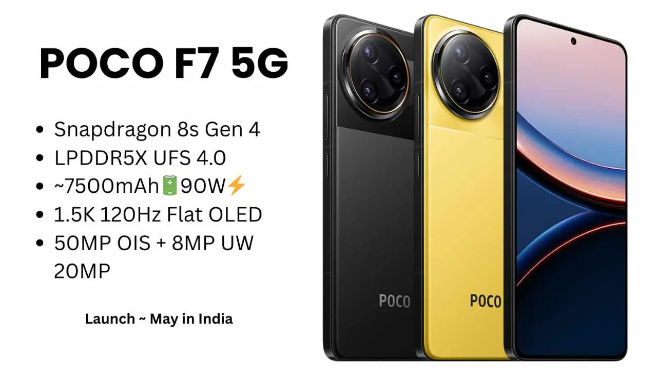 The POCO F7 5G may feature a 6.83-inch OLED display, Snapdragon 8s Gen 4 chipset, 7,550mAh battery, 90W fast charging, and a 50MP Sony LYT-600 primary camera.